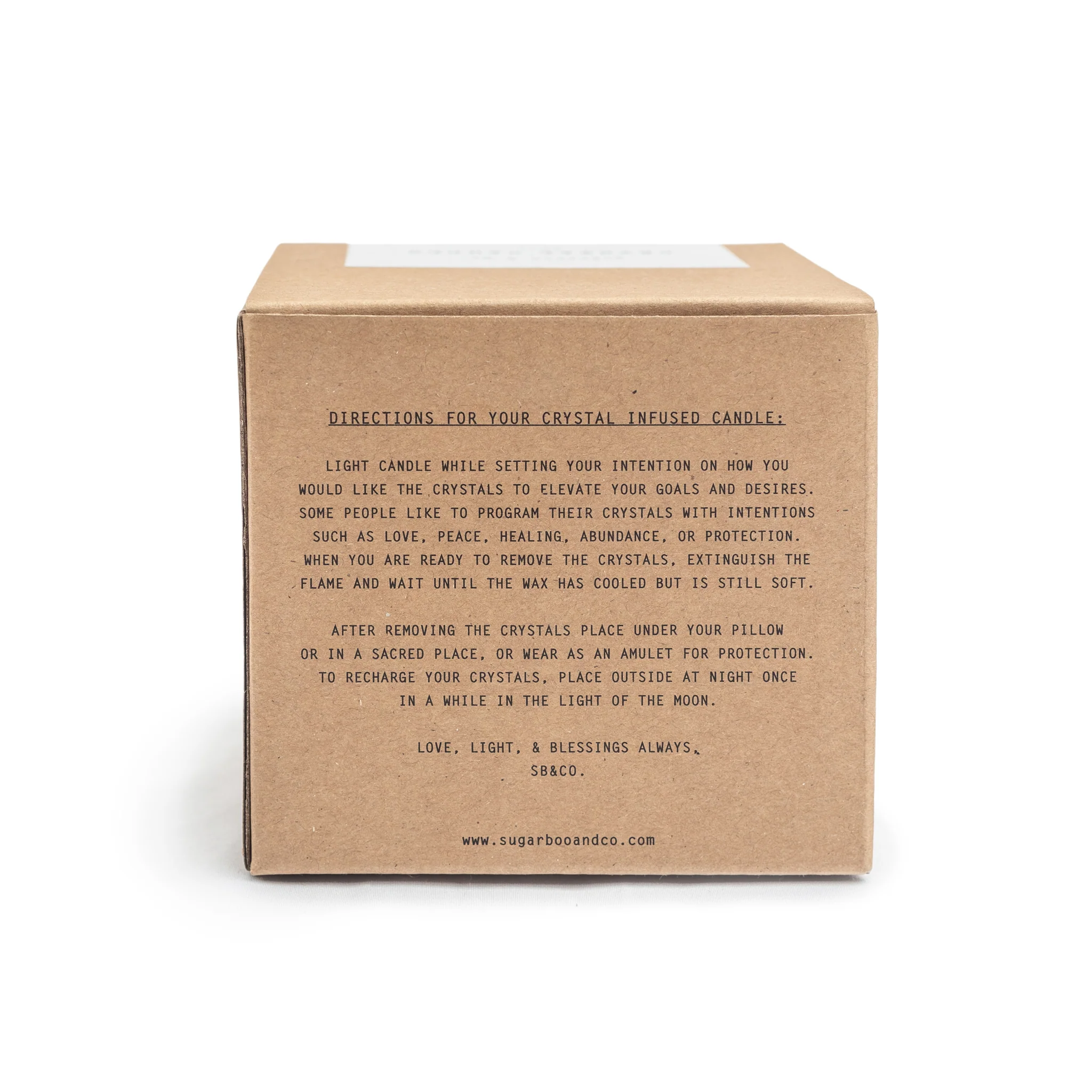 A note from the artist: Light the candle while setting your intention on how you would like the crystals to elevate your goals and desires. Some people like to program their crystals with intentions such as love, peace, healing, abundance, or protection. When you are ready to remove the crystals, extinguish the flame and wait until the wax has cooled but is still soft.